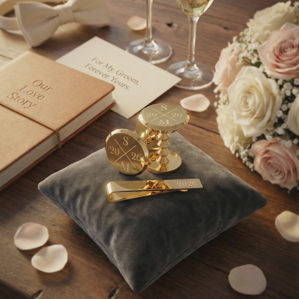 Personalised Gold Cufflink and Tie Clip Gift Set | Wedding Morning Keepsake | Chelsea Design